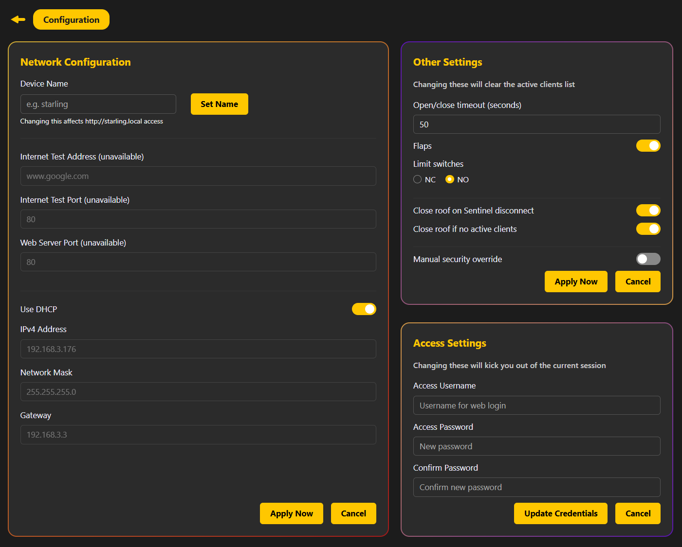 Starling 支持多种屋顶系统,包括 Lunatico 的 Caterpillar SSR 控制的自动化屋顶、第三方电机控制的屋顶(比如车库门电机)、由变频器(VFD)控制的三相电机驱动的屋顶。