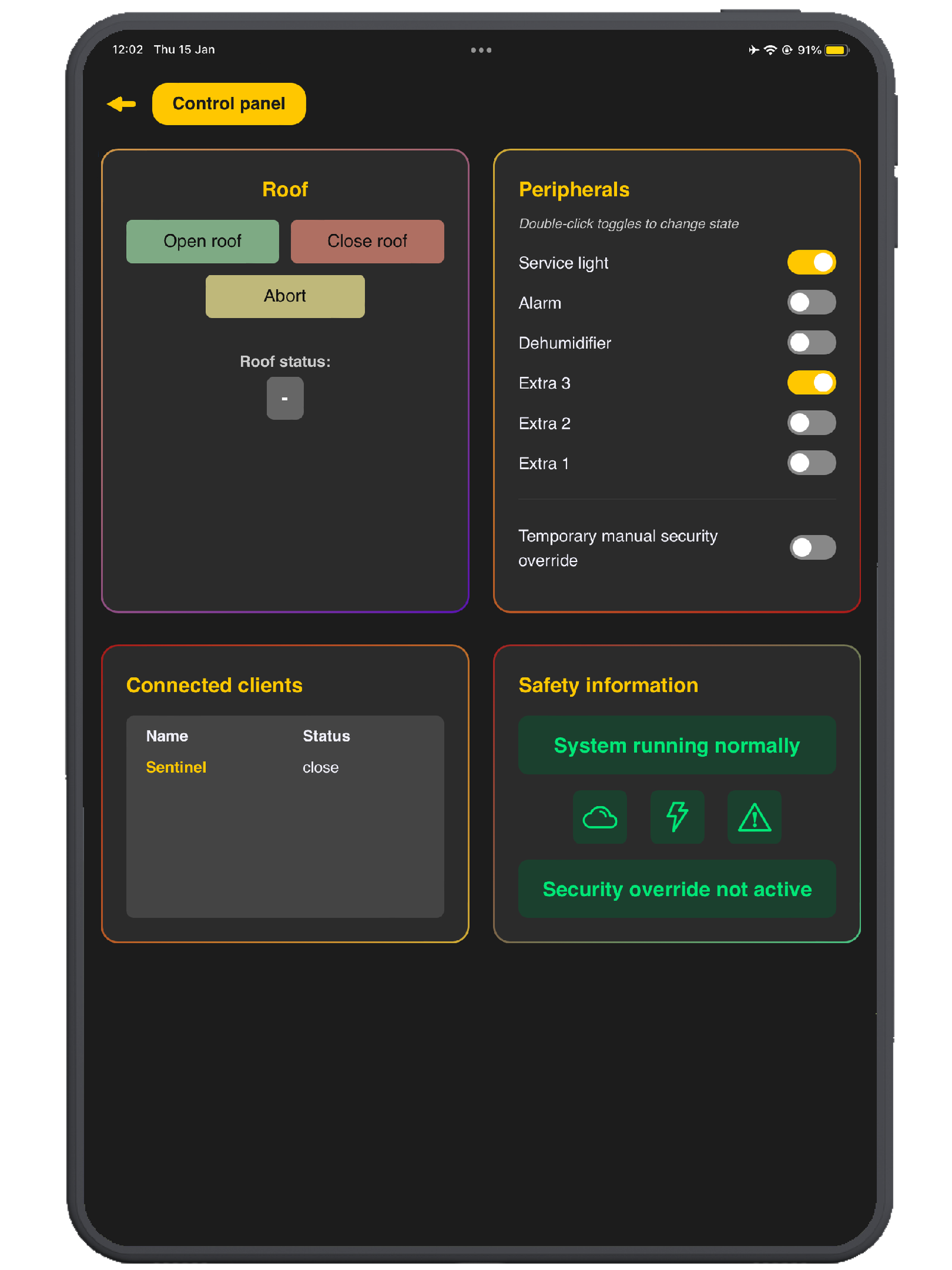 • 必要时强制接管安全权限,手动操作,如开关屋顶;